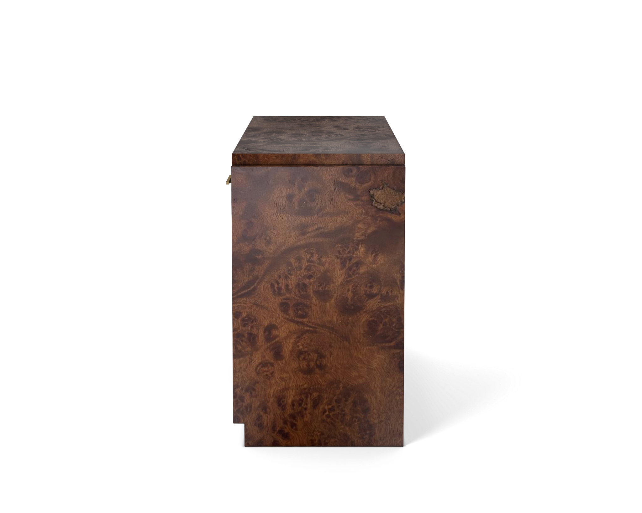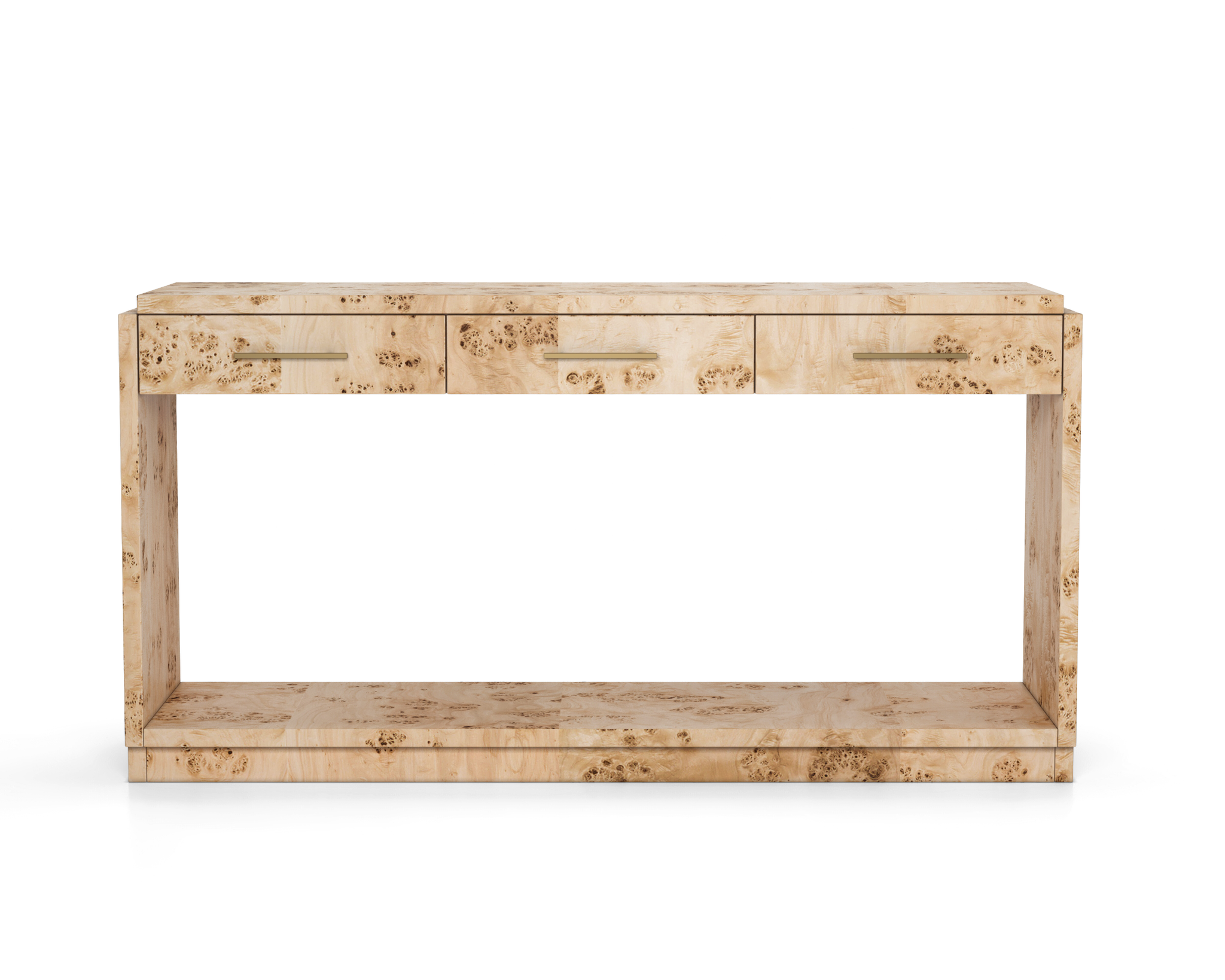 Each console highlights the unique patterns of burl wood, celebrating raw elegance in every swirl and knot. The streamlined silhouette complements a variety of design styles—from contemporary to classic—while the rich, tactile veneer adds depth and warmth. Built with meticulous craftsmanship, it delivers lasting durability and a smooth, polished finish that enhances the wood’s natural allure.